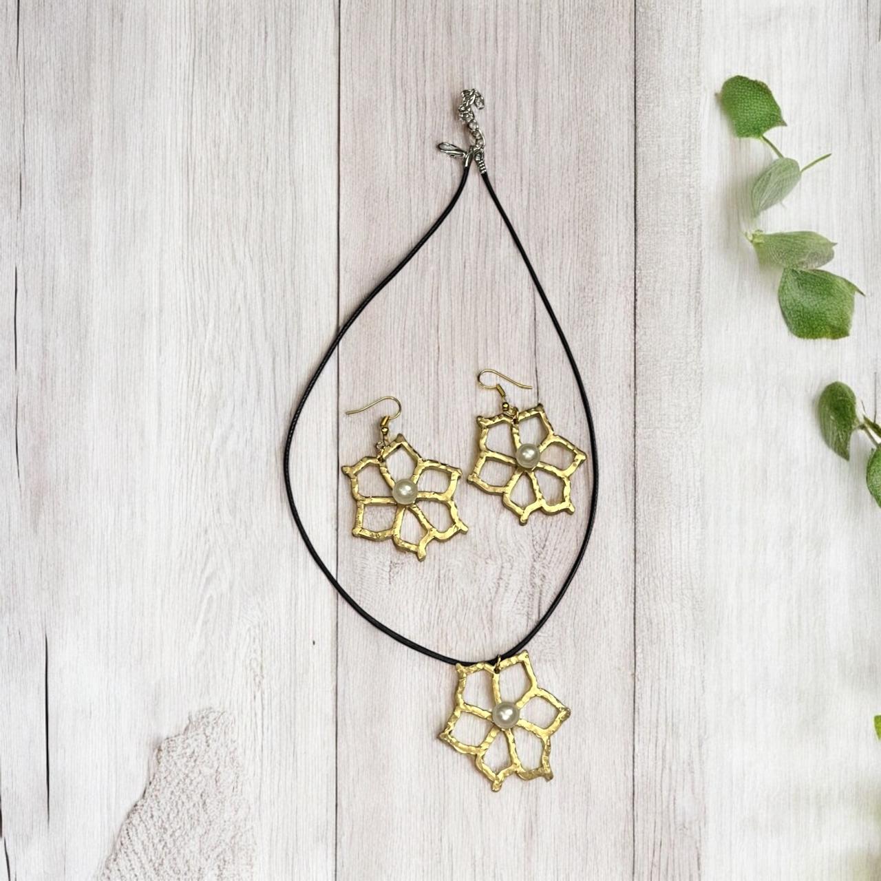 A beautifully crafted golden petal-themed jewelry set, including earrings and a matching pendant with pearl accents, perfect for a touch of elegance and sophistication.