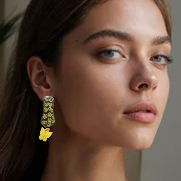 Add a touch of whimsy and sophistication to your style with our Golden Swirl Butterfly Earrings. These handcrafted earrings are made from premium wood and adorned with intricate golden swirl patterns, giving them a modern yet artistic appeal. At the base of each earring dangles a bright yellow butterfly charm, adding a playful and vibrant touch that stands out.