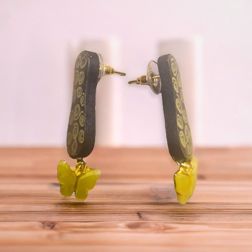 Unique wooden earrings featuring elegant golden swirl patterns, complemented by a vibrant yellow butterfly charm. Lightweight and stylish, perfect for a cheerful and bold look.